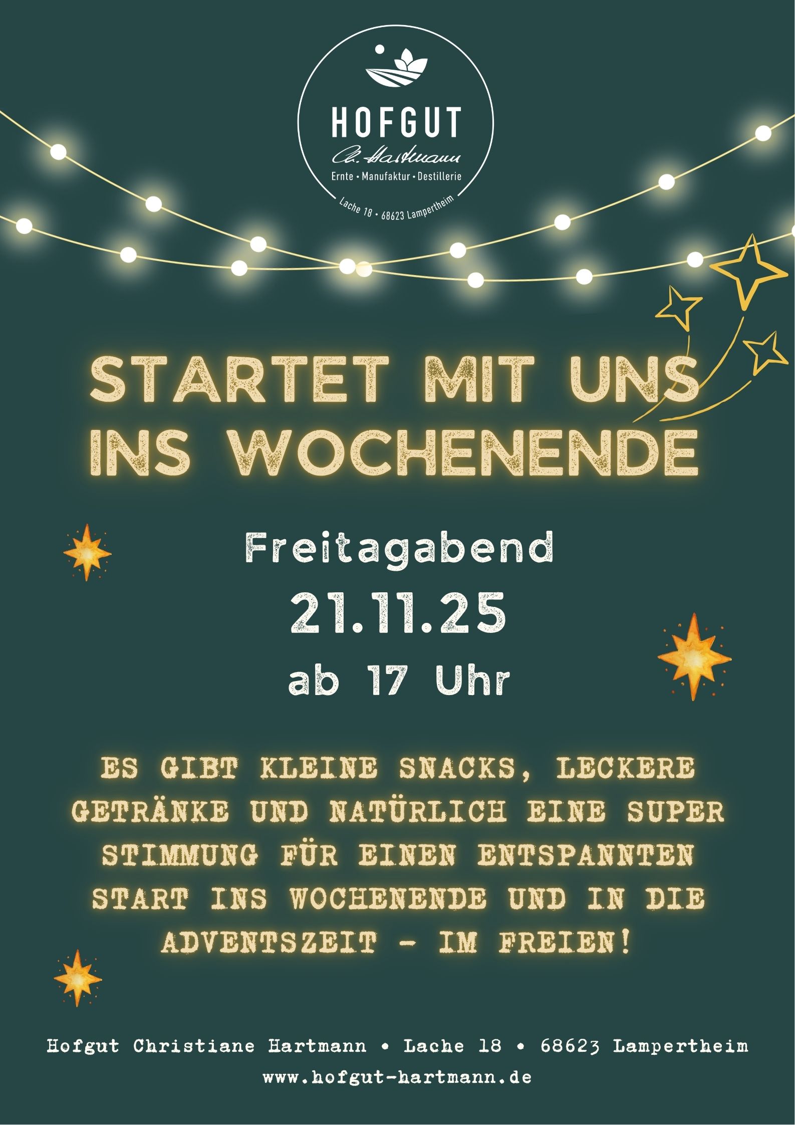 Am vierten Adventswochenende, 20.-22.12.24, findet auf dem Hofgut unser Weihnachtsmarkt statt. Freitags und samstags von 15 bis 21 Uhr, sonntags von 15 bis 19 Uhr.